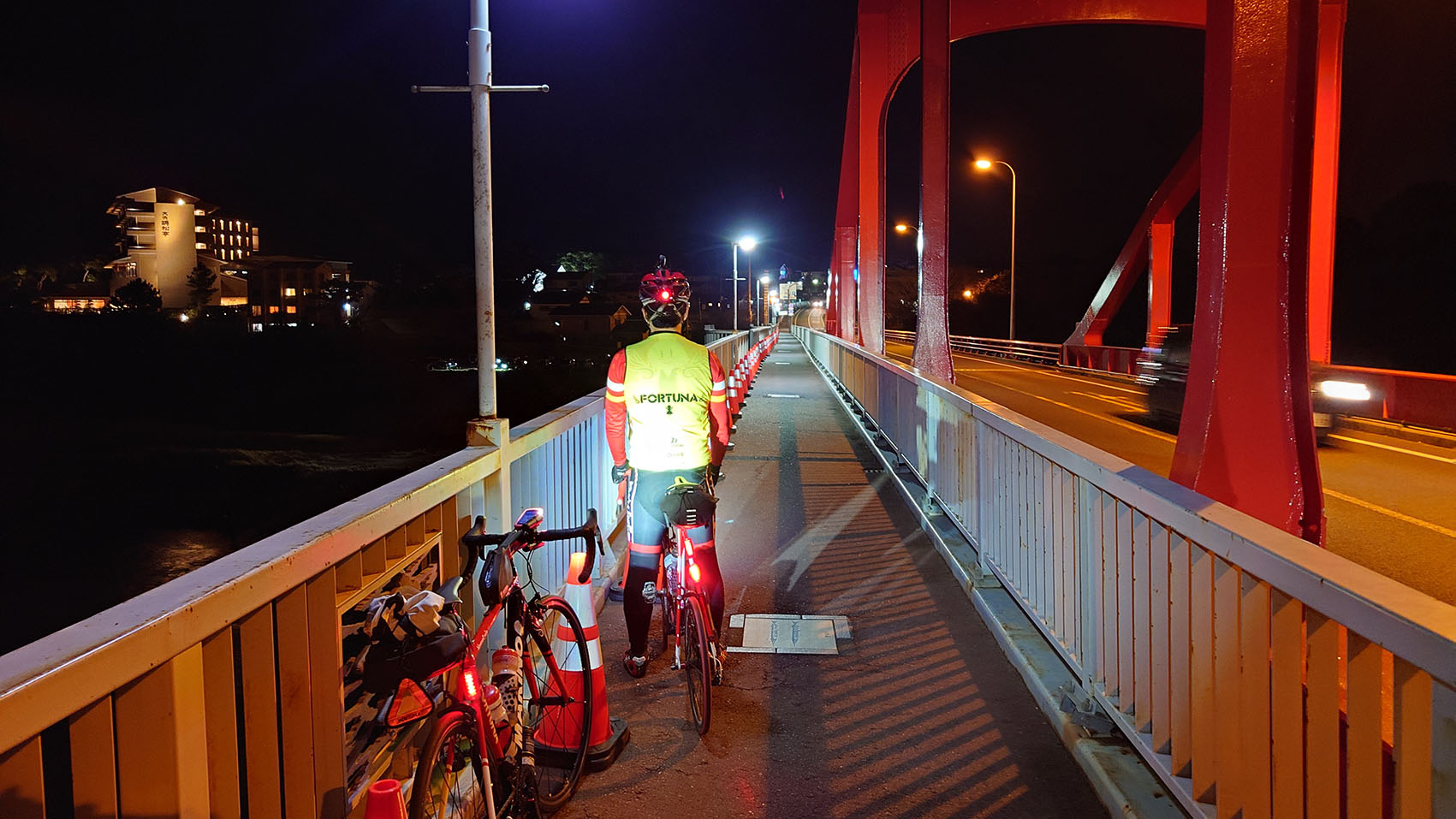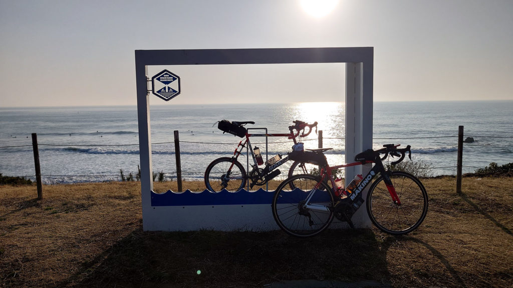 海門橋まで戻ってくればゴールは眼の前です。ゴール手前の海岸線の道は、路肩にキャッツアイがありますので、乗り上げないように注意して走行するようにしてください。